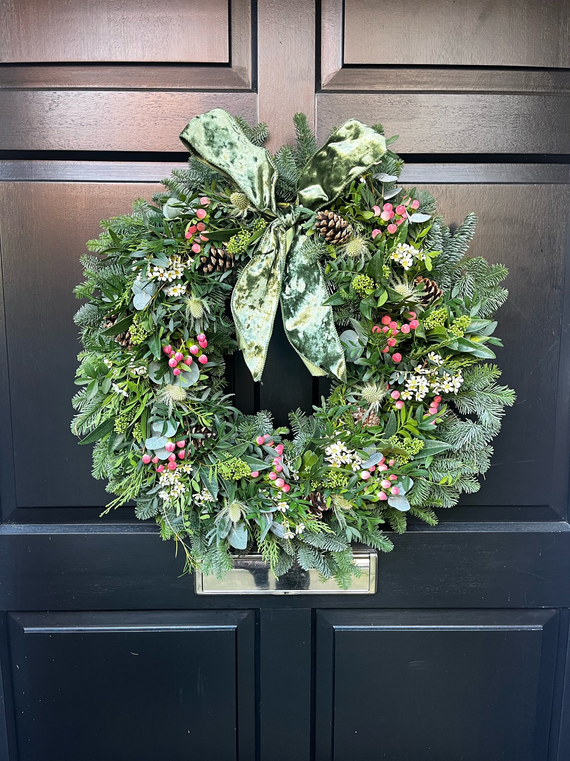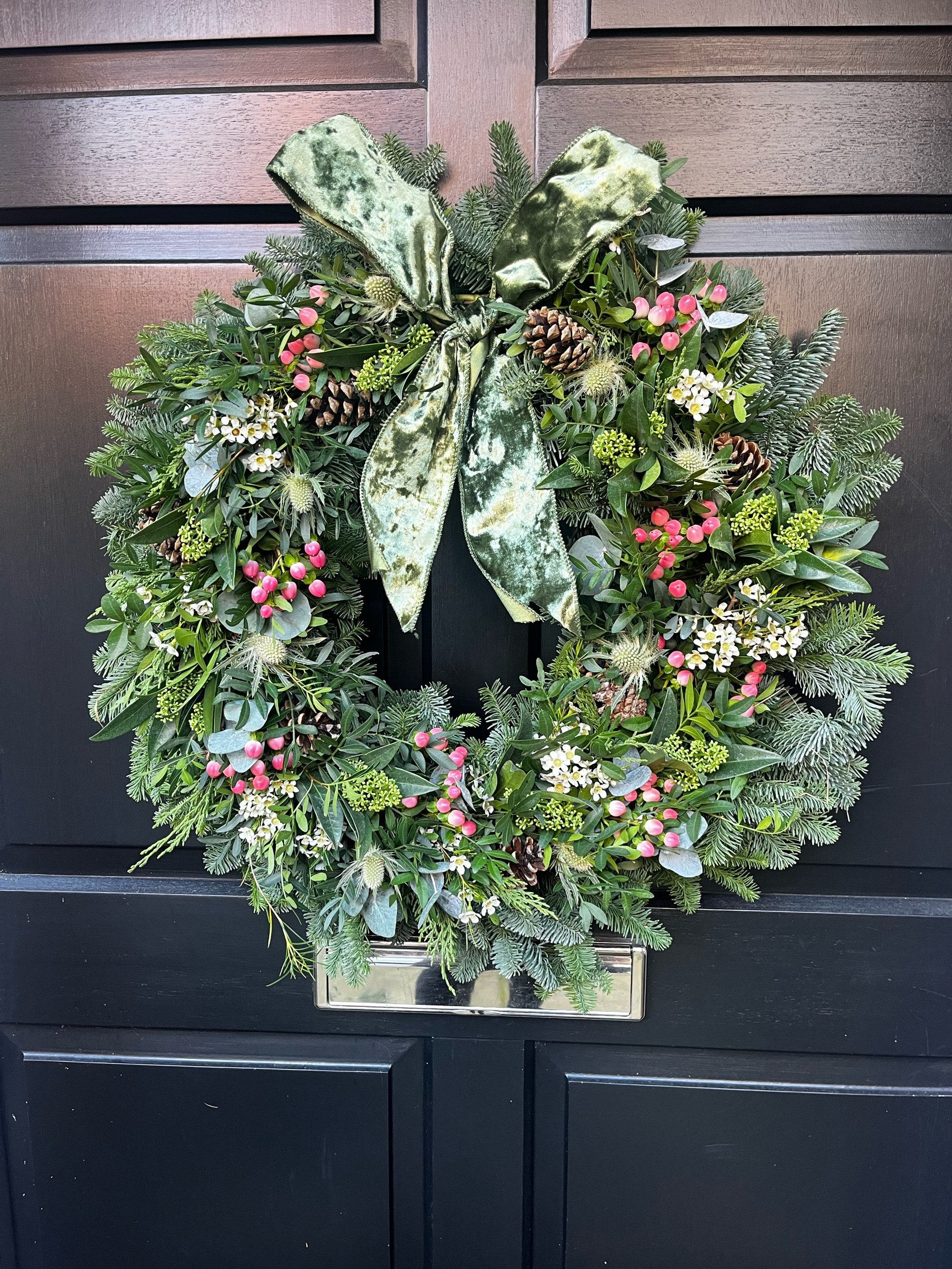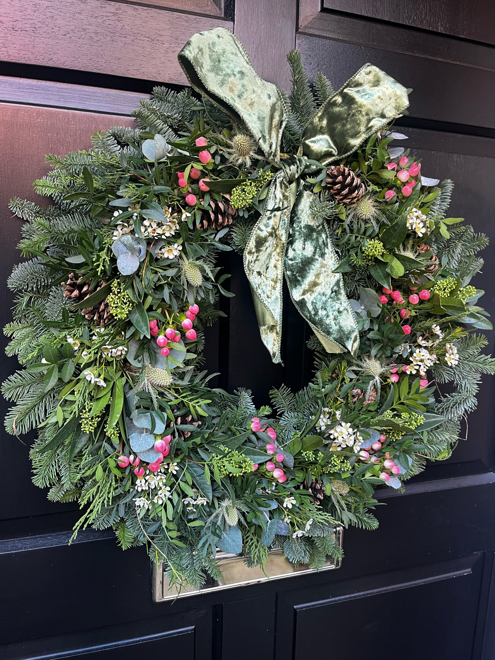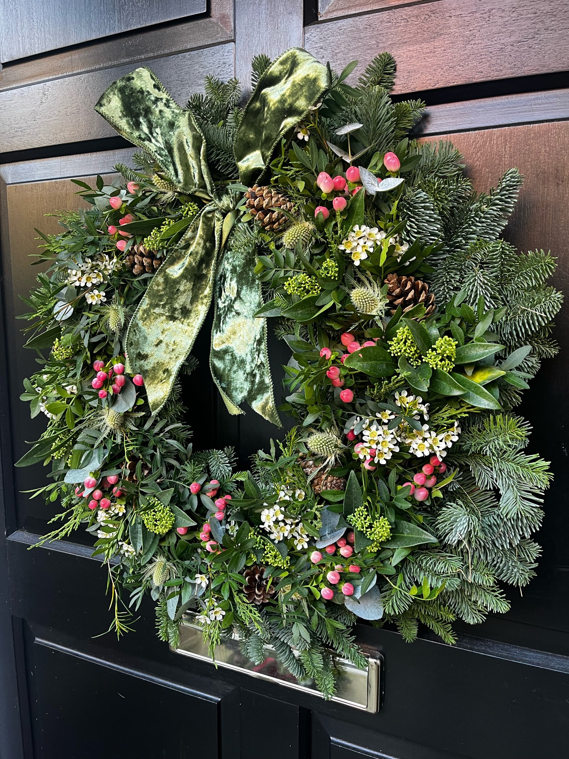 A refreshing twist on a Christmas wreath with beautiful pink Hypericum berries and bright green Skimmia paired with Waxflower, Pinecones and Limes.